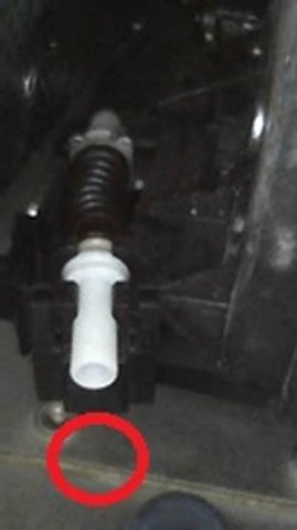 おやっ!画像11と比較すると、黒のケーブル部(赤丸)が抜けとるではないかい。そして、前述どおり「ドアハンドルのケーブルを引っ張った状態」=ゴムブーツが潰れている!のがわかりました。なら、破壊してしまえこのケーブル! ドアロックアクチュエータから外せば、引っ張りを開放できる!!