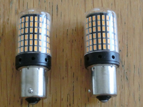 このレポートでDD3号(F25)のフロントウィンカー球をLED球に交換したことを報告したが、LEDの黄色い粒が見えてしまうことが気になっていた。そこで、新しいLED球を購入して、このレポートと同様にシルバーのスプレーで塗装してみることにした。購入したLED球を写真1に示す。