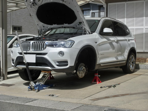 DD2号(E63)は低重心のクーペなので、カーブ走行時にあまりロールしないが、DD3号(F25)は重心が高いせいなのか、ショックアブソーバーが劣化しているせいなのか、まぁまぁロールする。そこで、まずはDD3号(F25)のショックアブソーバーが劣化していないかどうか調べてみることにした。とりあえず、フロント左のショックアブソーバーをチェックするため、写真1のように前側にウマをかけて、左前ホイールを外す。