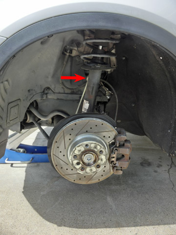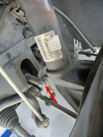 写真1 左前ホイールを外したところ最初に、写真2のスタビリンクの上側を外す。