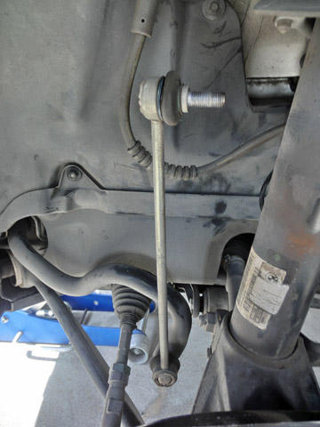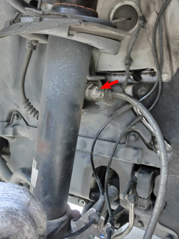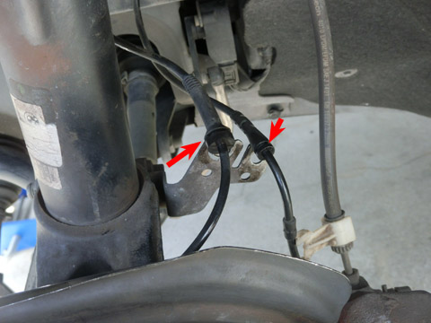 写真5 取り外したスタビリンク次に、ストラットの下部のホールド部分を外すのだが、そのまえに写真6のケーブル類を外しておこう。