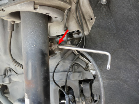 写真7 ストラット下部の固定ナットこの締め付けトルクは60Nmだ。ここからストラットを外すためには、裏側にあるアクスルキャリアのストラットをホールドする部分の隙間を広げないといけない。そのために、写真8のタガネを使う。
