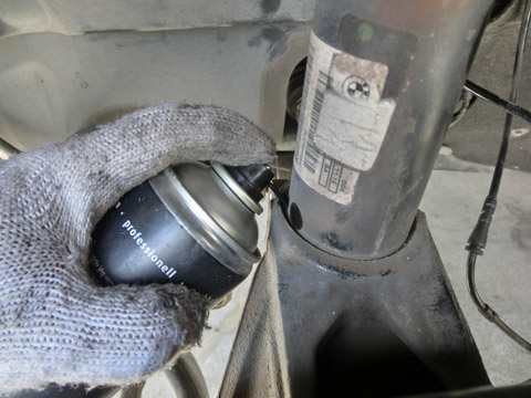 写真8 タガネこれをストラットの裏にあるホールド部分の隙間に入れるのだが、その前にストラットが抜けやすいように、写真9のように潤滑スプレーを吹いておこう。