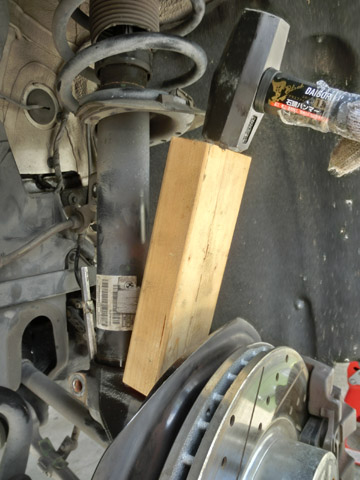 写真11 ストラットを抜いているところ木片を叩いていくとストラットが少しずつ抜けていくのだが、隙間を広げ足りないからだろうか、うまく最後まで抜けない。頑張ればこのままストラットを抜いてしまうこともできるだろうが、今度は入れるときに苦労しそうなので、今日はこのあたりで勘弁しておいてやろう。アクスルキャリアのストラットをホールドする部分を広げるSSTを準備してから再挑戦だ。