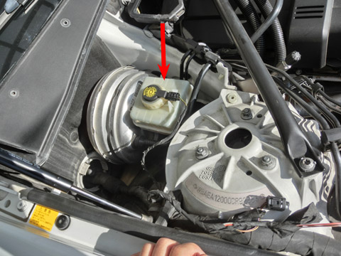 写真1 ウマをかけたところブレーキフルードタンクは写真2の赤矢印のところにある。