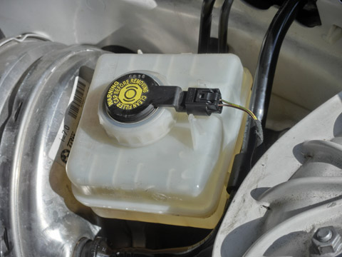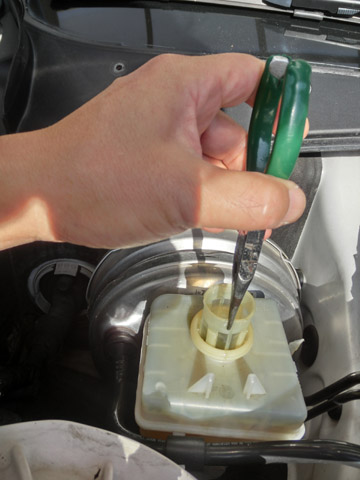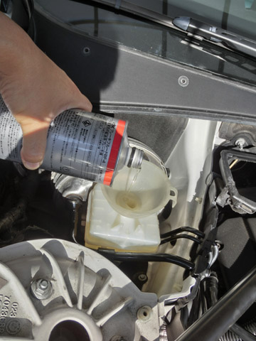 写真14 新しいタンクを取りつけたところ最後に、写真15のようにタンクに新しいブレーキフルードを入れ、各輪のブレーキキャリパーから古いフルードを抜いていく。