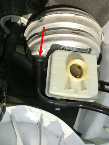 写真6 古いブレーキフルードを抜いているところおおよそタンクからフルードが抜けたら、次は写真7の赤矢印のところにあるブレーキブースターに接続されているバキュームパイプを外す。