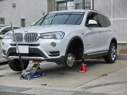 以前のレポートで、DD3号(F25)のフロントショックアブソーバーの劣化をチェックしようとして途中で断念したことを報告したが、アクスルキャリアのストラットをホールドする部分の隙間を広げるSSTを手に入れたので再挑戦だ。まずは、写真1のようにフロント側にウマをかけて、左前ホイールを外す。