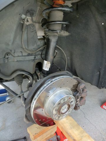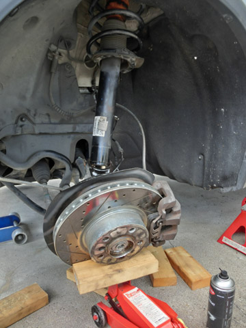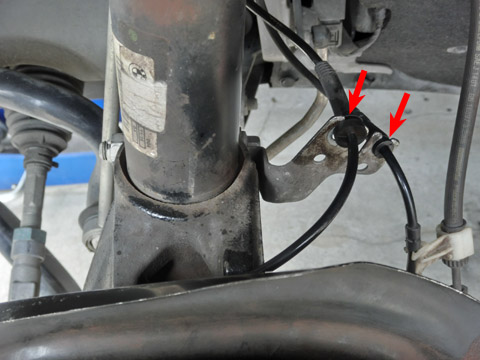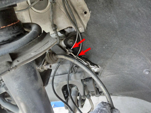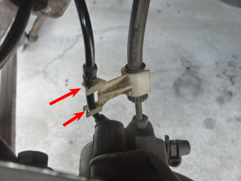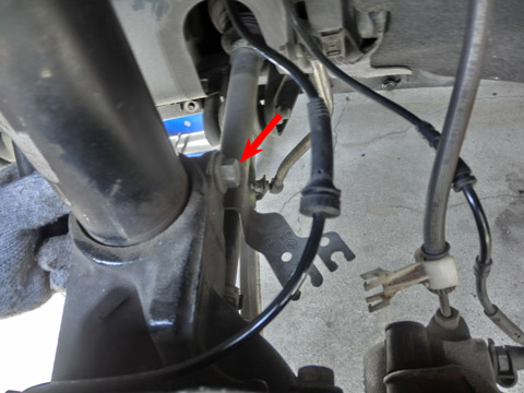 写真1 ウマをかけて左前ホイールを外したところそして、最初に写真2〜4のケーブル類を外しておく。