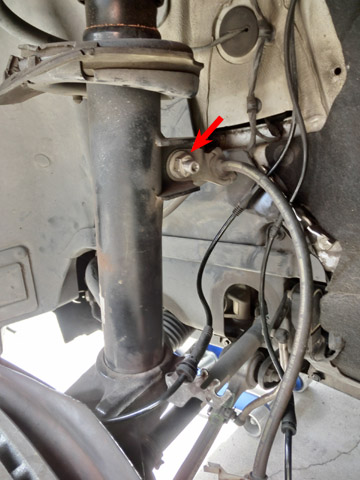 写真7 スタビリンク上側を外したところ次は、写真8に示すストラット下部を固定しているボルトを外す。