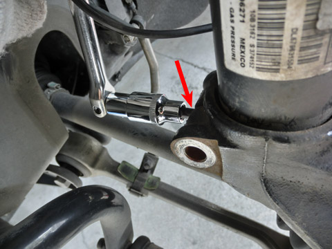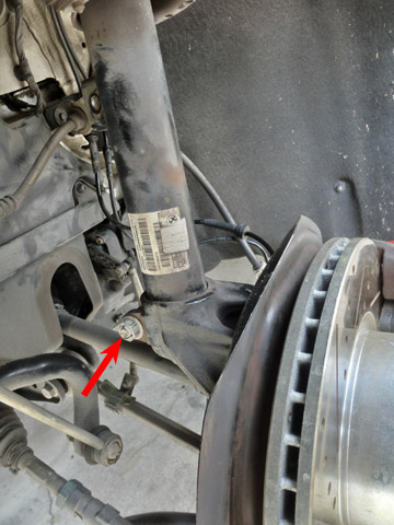 写真8 ストラット下部を固定しているボルトこれを外すためには、写真9のナットを緩めればいい。ナットは対辺18mm、ボルトは対辺16mmだ。