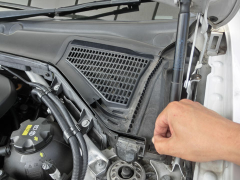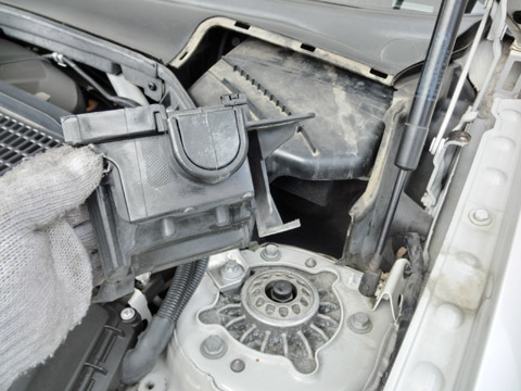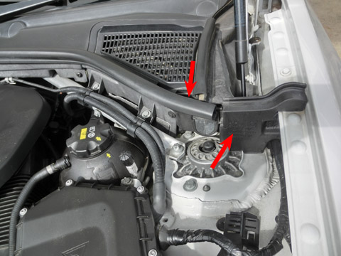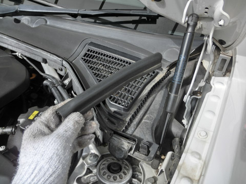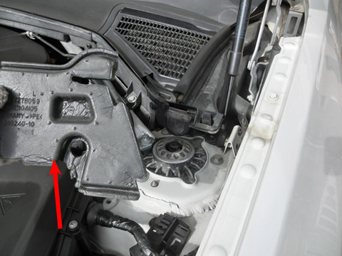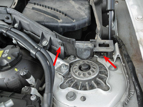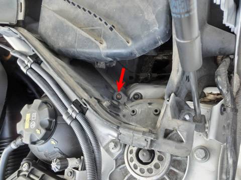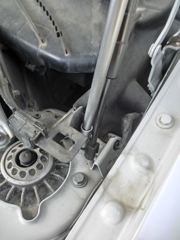 さて、ここまで外せたら、次はストラットの上部にあるボルトを緩めるのだが、そのボルトにアクセスするために、エンジンフード内でいくつか外すものがある。まずは、写真10の赤矢印で示すインシュレータ類を外す。
