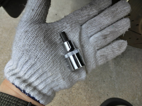 写真18 隙間を広げるSSTこのSSTはストラットスプレッダーというらしく、購入した3種類の一つだ。価格は、3種類一緒で1,114円(送料込み)であった。このSSTは、写真19のように先端が楕円柱のようになっている。