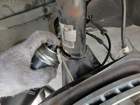 写真20 SSTで隙間を広げたところ写真21のようにストラットの下部とアクスルキャリアの間に潤滑スプレーを吹く。