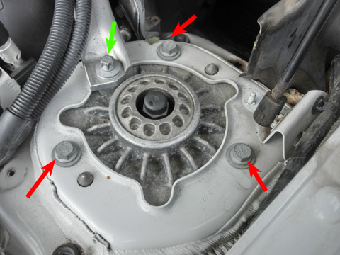 写真22 ストラット上部のボルト赤矢印の3本は13mmのソケットレンチで、緑矢印のボルトはトルクスE14のソケットレンチで緩める。ちなみに、締め付けトルクは、赤のボルトが28Nm、緑のボルトが56Nmだ。これで準備が整ったので、写真23のようにアクスルキャリアに木片をあてがってハンマーでたたいてストラット下部をアクスルキャリアから外す。