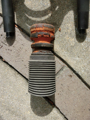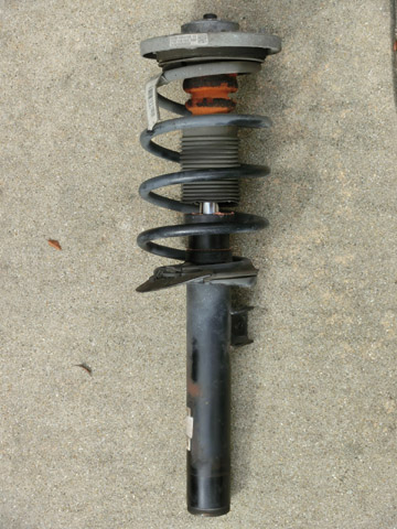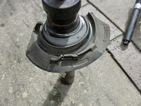 写真24 取り出したストラットこのストラットの上部を見ると、写真25のようにトップナットの部分に黒のゴムカバーがある。
