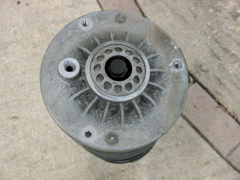 写真26 ストラットのトップナットこのトップナットを外せばショックアブソーバーを抜く出すことができるのだが、その前に写真27のようにしてスプリングコンプレッサーを使ってスプリングを縮める。