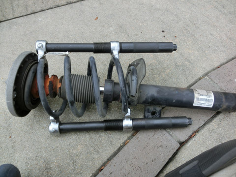 ショックアブソーバー類のチェックが終わったら、分解したときと逆順で組み立てればいい。ただ、ストラットを組み立ててから写真35のようにジャッキを使ってストラット下部をアクスルキャリアに入れようとしたのだが、なかなか入らない。