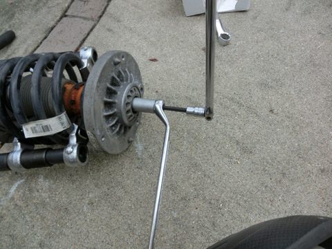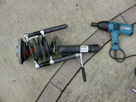 写真27 スプリングコンプレッサーをかけたところそして、写真28のようにインパクトドリルやラチェットレンチを使いながら、慎重にスプリングを縮めていく。