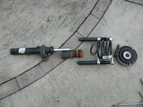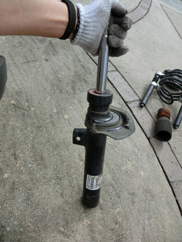 写真30 ストラットを分解したところ写真31のようにしてショックアブソーバーの軸を押して縮めてみると、少しだけ抵抗はあるが片手で楽に縮めることができる。