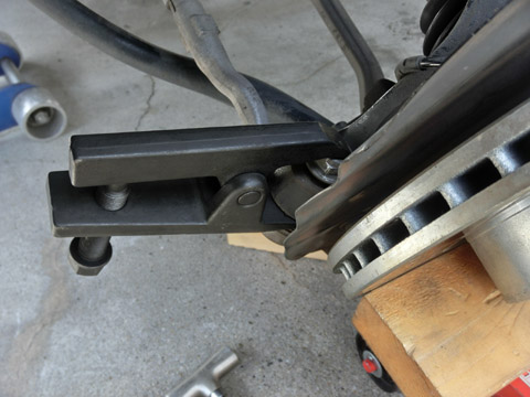 写真19 SSTの先端これの短径側をアクスルキャリアのストラットをホールドする部分の隙間に入れてから、写真20のように90度回転させれば、長径側が隙間を広げてくれるという代物だ。
