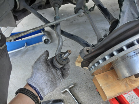 写真36 タイロッドエンドプーラーをかけたところすると、カキンという音とともにタイロッドエンドの勘合が外れる。写真37に外れたタイロッドエンドを示す。