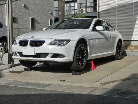 写真1 ウマをかけたところそして、エンジンルーム下のアンダーパネル(スプラッシュガード)を取り外す。写真2に取り外したアンダーパネルを示す。