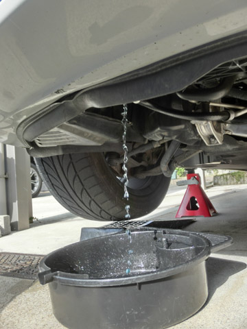 写真5 クーラントを抜いているところクーラントが抜けたらエキスパンションタンクを外す。エクスパンションタンクは写真6の2つのT-20トルクスネジで固定されているので、まずそれらを外す。