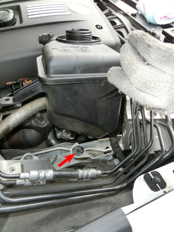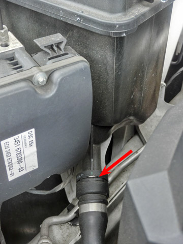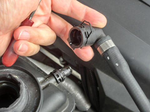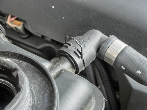 写真8 ホースを外したところ一方、写真9のようにエキスパンションタンクの下にもワンタッチコネクタがある。