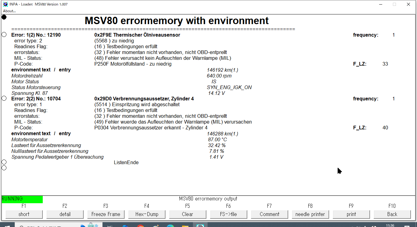 先日、DD2号(E63)のエンジンをかけてみると、シルキーシックスの滑らかな回転ではなく、ガタガタと振動しながらエンジンが回っている。おまけにエンジン警告灯も点灯している。どうも1気筒死んでいるようだ。その後、しばらくすると滑らかな回転に戻ったのだが、ちょっと気になる。何が起きたのかを調べるためにINPAでエラーを調べてみたところ、図1にようなエラーが記録されていた。