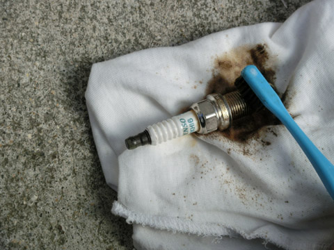写真11 プラグの先の煤を落としているところ洗浄後は写真12のように綺麗になった。