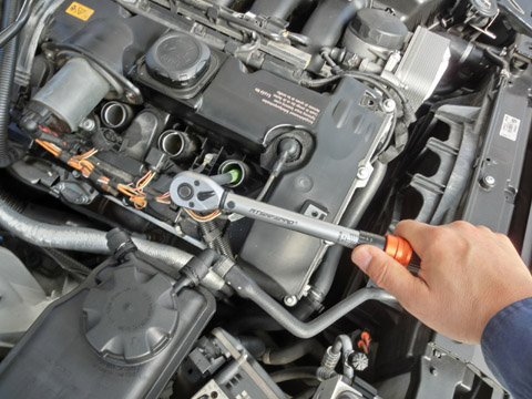 写真12 洗浄後のプラグ最後に外したものを元通りに戻せば作業完了だ。プラグ取り付けの際には、写真13のようにトルクレンチを使って締め付けトルクを確保しよう(30Nm)。
