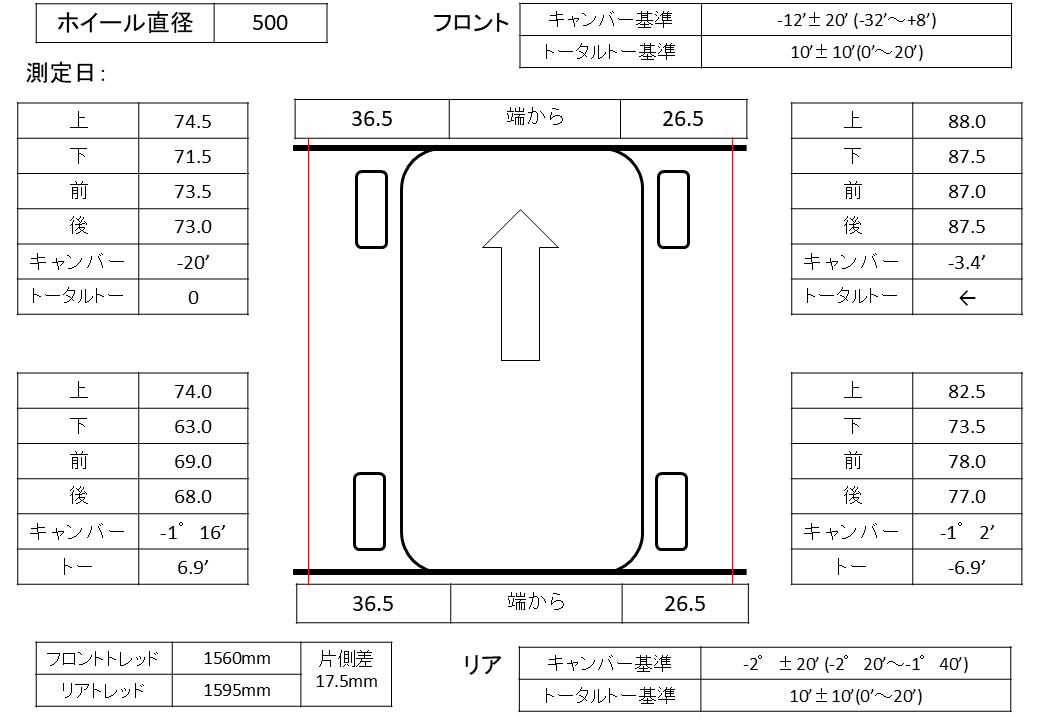 図1 アライメントの測定結果ホイールの直径が500mmなので、これを利用して各ホイールのアライメントを計算する。