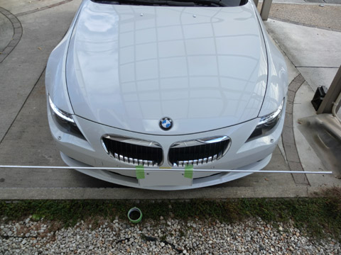 まずはタイヤの空気圧を同じにして、タイヤの下にスロープや板を敷いて4輪の高さを揃えて車体を水平にする。その後、写真1のようにアルミ棒の中心とフロントバンパーの中心が一致するように養生テープで固定する。